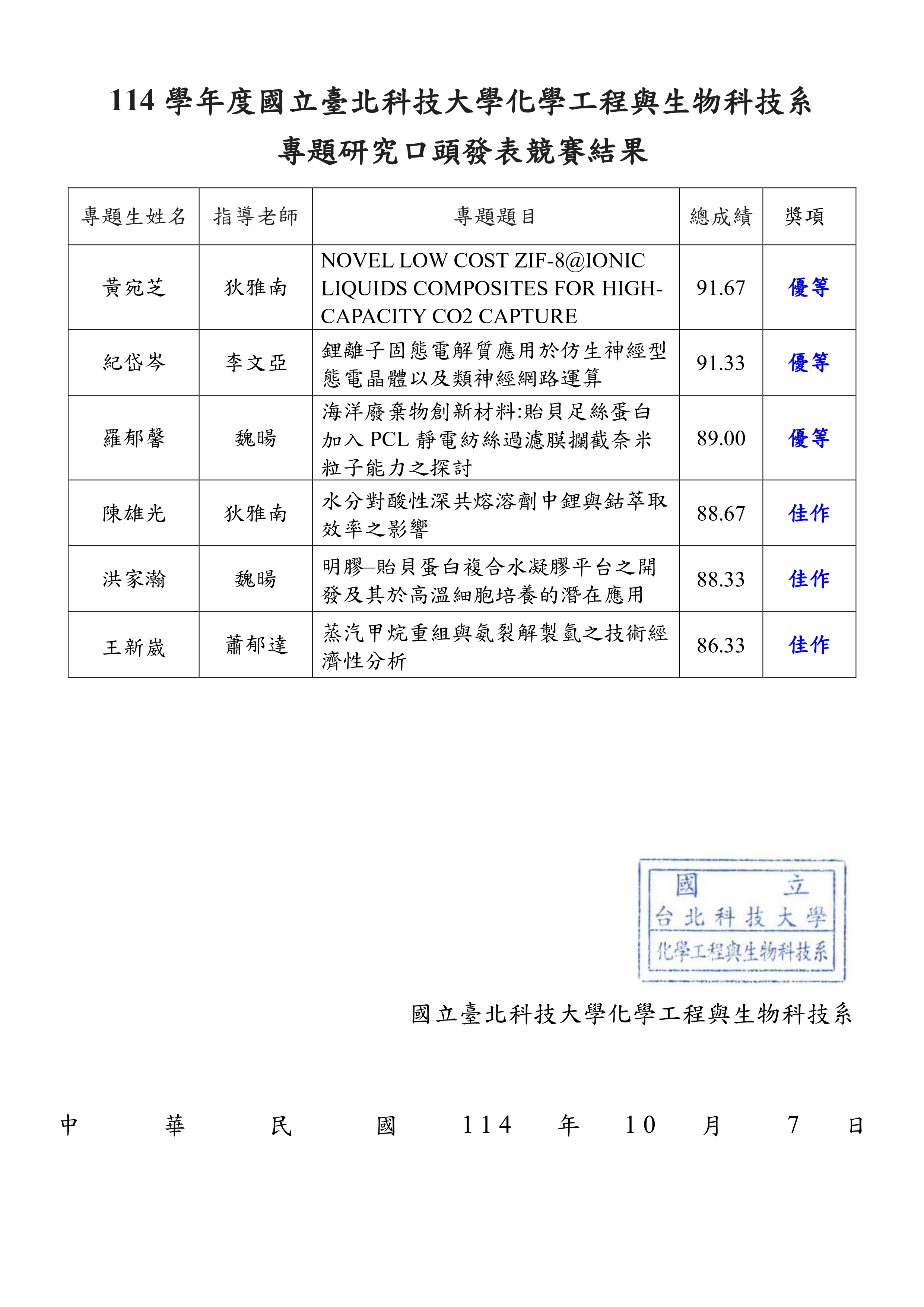 【公告】114學年度化工系專題研究口頭發表競賽結果